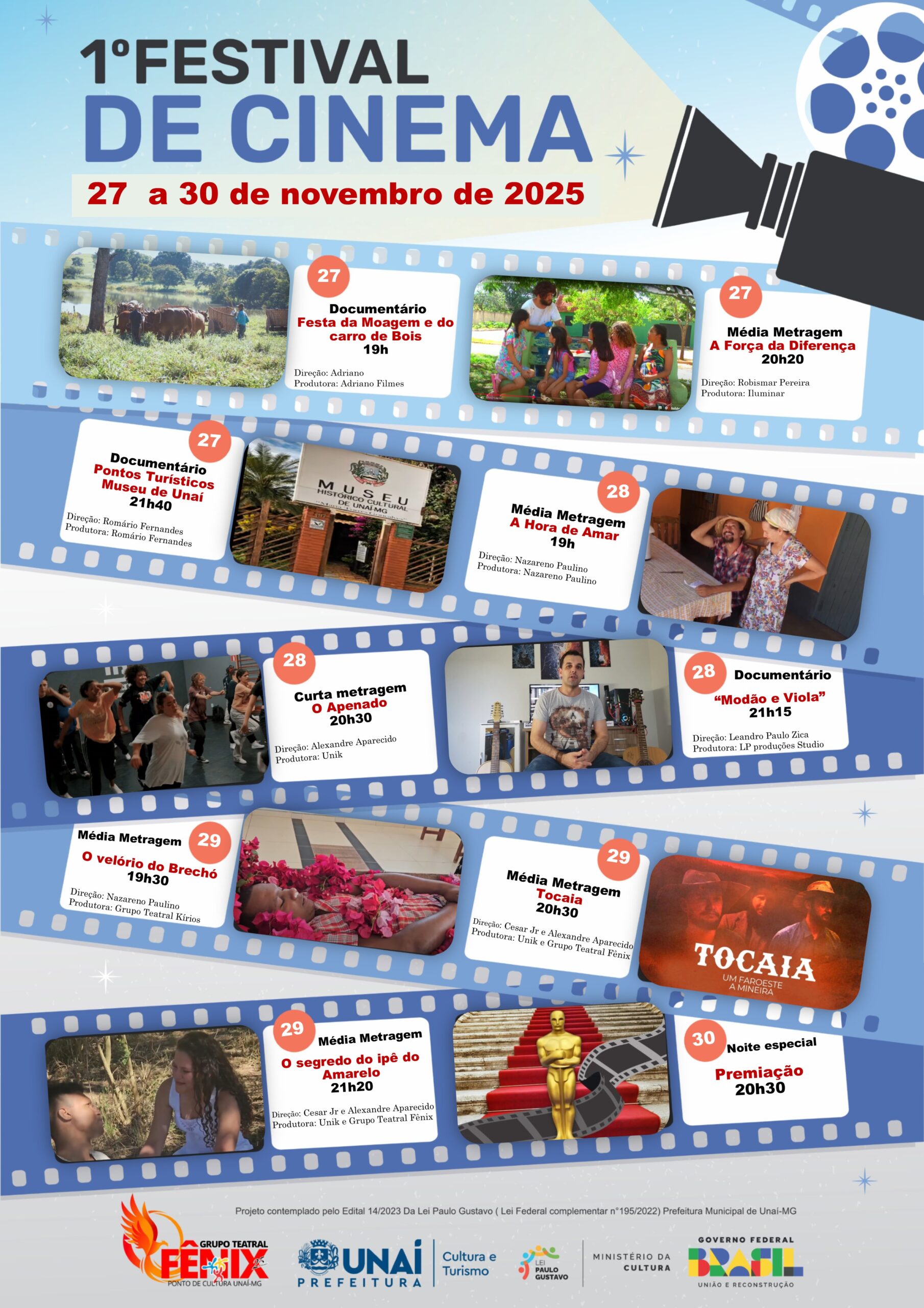 O Grupo Teatral Fênix realiza, de 27 a 30 de novembro, o 1º Festival de Cinema Amador de Unaí, no Centro Cultural do grupo, com uma programação repleta de atrações gratuitas para o público de todas as idades. O evento reúne amantes da sétima arte em uma verdadeira celebração do audiovisual, com exposições temáticas, oficinas, palestras e exibição de curtas e filmes de sucesso do cinema nacional.